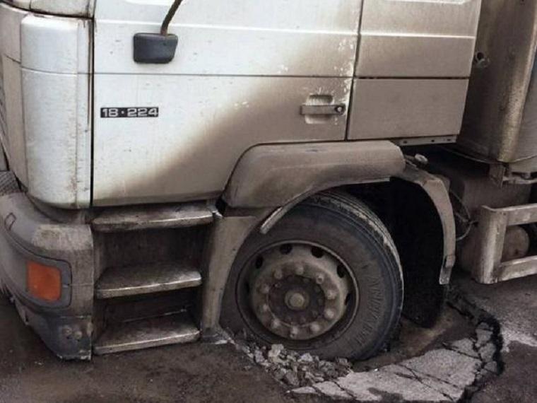 Поліцейські кажуть, що наразі невідомо, чи були там ями в асфальті, а водій їх не побачив, чи все-таки асфальт провалився під вантажівкою.