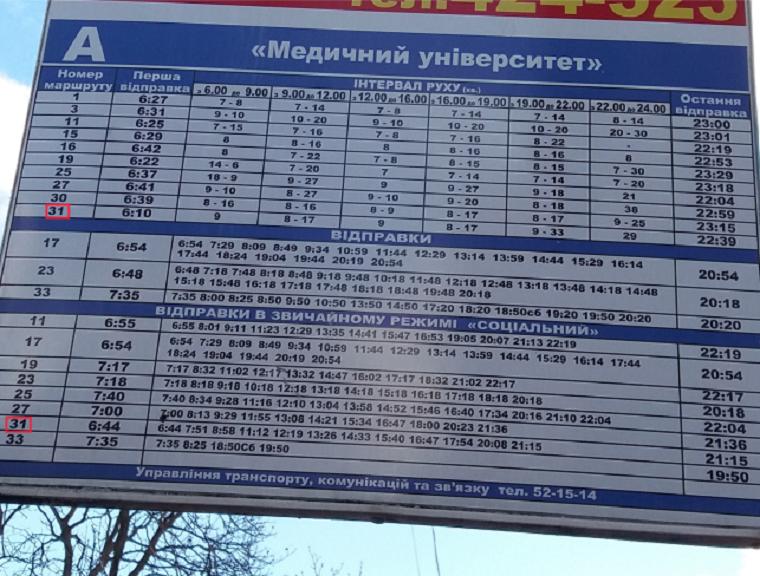 За словами автора петиції Петра Беріта, на деяких зупинках взагалі немає табличок з графіком. Але якщо є, то вони некоректні. Напркилад, зупинка Медичний університет обладнана табличкою на триметровій висоті, до того ж, з графіком руху 31 маршруту, який вже декілька років не їздить через цю зупинку.