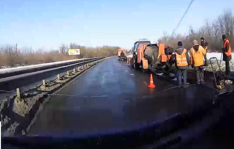 Далі уточнює, що у калюжу завдовжки кілька сотень метрів і завглибшки 10-15 см, яка скриває вибоїни глибиною подекуди до 30 см, дорожні працівники кидають лопатами асфальт.