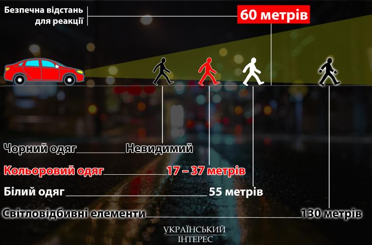 В Україні у також прописано, що пішоходи у вечірній час, і у несприятливі погодні умови повинні мати на одязі світловідбиваючі елементи.